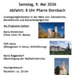 Samstag, 9. Mai 2026 Die Fahrt startet in Dornbach und nachdem alle Personen von den weiteren Pfarren zugestiegen sind, geht es zuerst nach… - Flohmarkt der Pfarre Dornbach – 22. März 2026