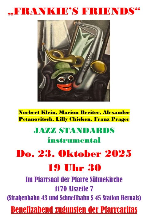 Norbert Klein, ehemaliger Pastoralassistent in der Sühnekirche spielt am 23.10.2025 um 19.30 Uhr mit einer Gruppe Gleichgesinnter jazziges zu Gunsten der Pfarrcaritas im Pfarrsaal der Pfarre Sühnekirche