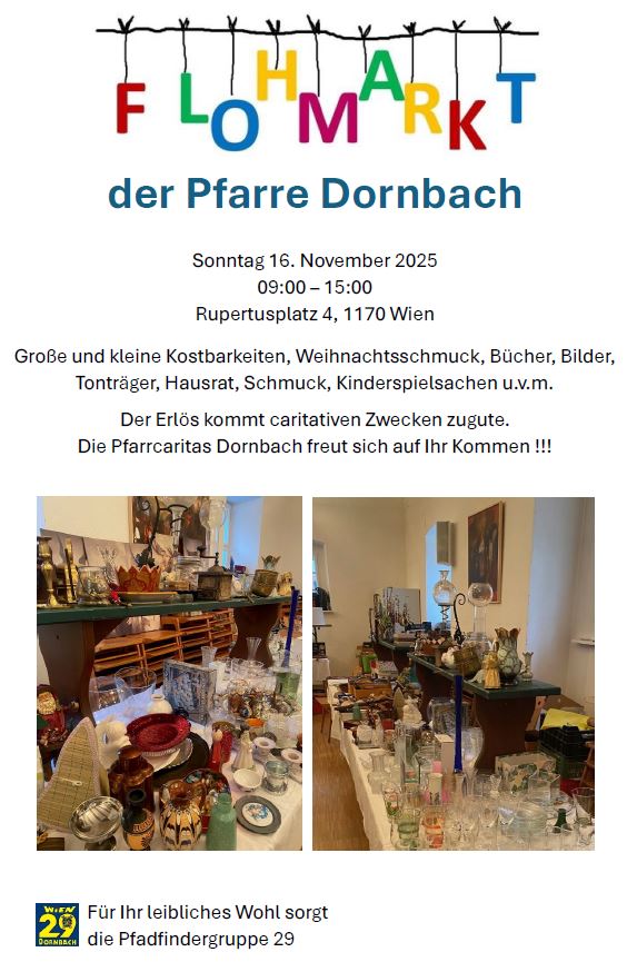 Am 16.11. findet der Dornbacher – Pfarrflohmarkt wieder statt. Flohmarktware kann im Pfarrsaal abgegeben werden: